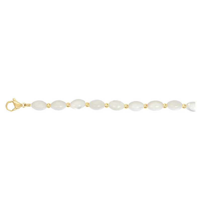 OverzichtDe iXXXi armband Lush is gemaakt van stainless steel. De goudkleurige armband bestaat uit ovale kralen van glanzende shell. De kralen worden afgewisseld met kleine goudkleurige kraaltjes die zorgen voor een subtiel accent. Mix en match met meerdere iXXXi armbanden uit onze collectie en maak zo jouw 'armparty' compleet.